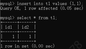 --在id1和id2中都插入数值1 mysql> insert into t1 values (1,1); mysql> select * from t1;