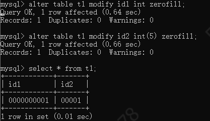--分别给id1和id2字段增加zerofill参数 mysql> alter table t1 modify id1 int zerofill; mysql> alter table t1 modify id2 int(5) zerofill;