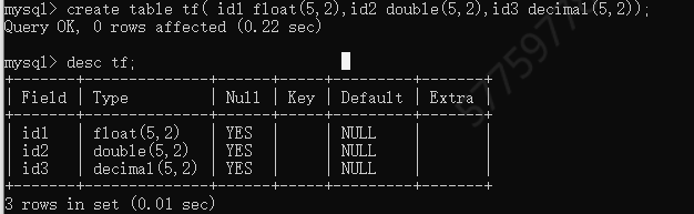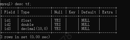 --创建表tf,分别将id1,id2,id3字段设置为float(5,2),double(5,2),decimal(5,2) mysql> create table tf( id1 float(5,2),id2 double(5,2),id3 decimal(5,2));