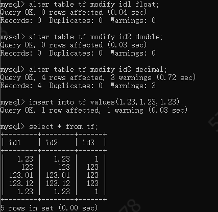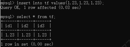 --向表中三个字段分别插入数据1.23 mysql> insert into tf values(1.23,1.23,1.23);