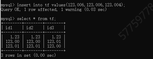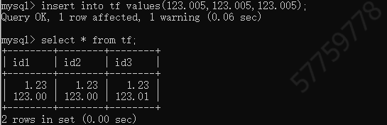 --向表中分别插入数据123.005 mysql> insert into tf values(123.005,123.005,123.005);