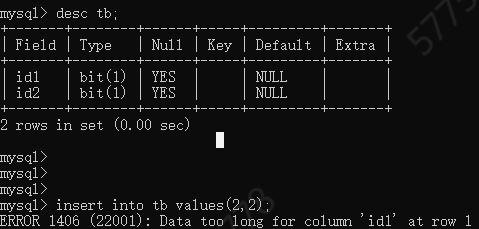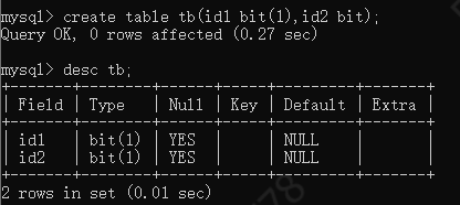 --创建表tb,定义字段id1为bit(1),id2字段为bit mysql> create table tb(id1 bit(1),id2 bit);