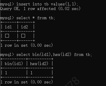 --向tb中插入1,1 mysql> insert into tb values(1,1); mysql> select * from tb; mysql> select bin(id1),hex(id2) from tb;