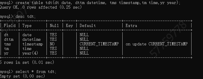--创建表tdt mysql> create table tdt(dt date, dttm datetime, tms timestamp,tm time,yr year);