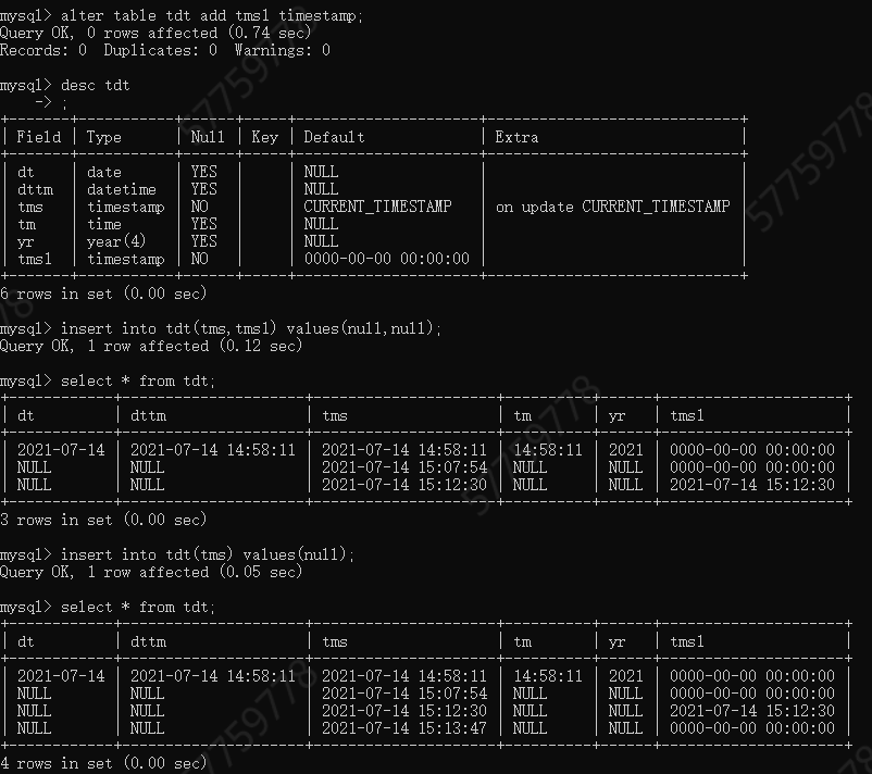 --修改表tdt,增加TIMESTAMP类型的tms1列,并给tms,tms1赋值null mysql> alter table tdt add tms1 timestamp; mysql> desc tdt; mysql> insert into tdt(tms,tms1) values(null,null);