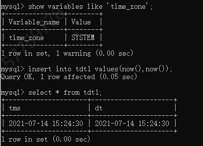 --查看当前时区,并向表tdt1中插入系统时间 mysql> show variables like 'time_zone'; mysql> insert into tdt1 values(now(),now());