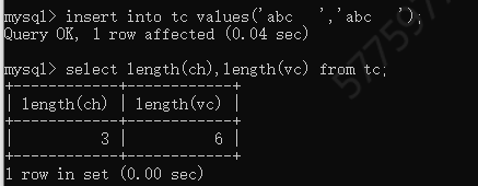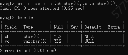 --创建表tc,包含两个字段ch(char(6))和vc(varchar(6))