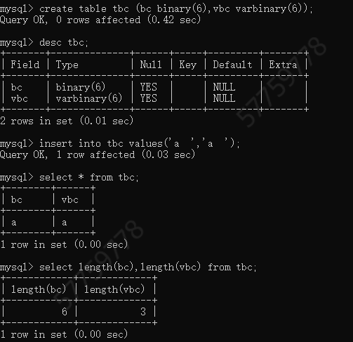 mysql> create table tbc (bc binary(6),vbc varbinary(6));