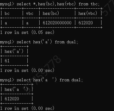 --通过hex()函数查看tbc中数据的保存 mysql> select length(bc),length(vbc) from tbc;
