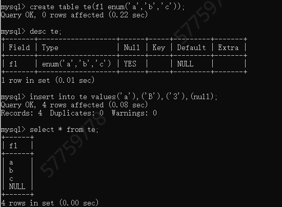 mysql> insert into te values('a'),('B'),('3'),(null);