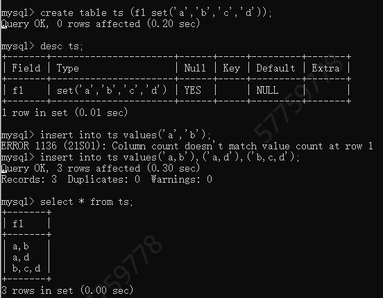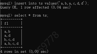 mysql> insert into ts values('a,b'),('a,d'),('b,c,d');