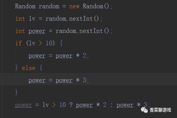比如在战斗的时候,需要根据玩家的等级进行战斗力的放大,所有有下面的代码,可以看到用三元运算符代码行数较少,而且逼格显然比较高。