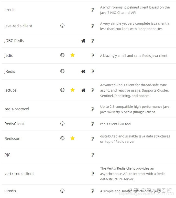 Redis 官网展示的 Java 客户端如下图所示,其中官方推荐的是标星的3个:Jedis、Redisson 和 lettuce。