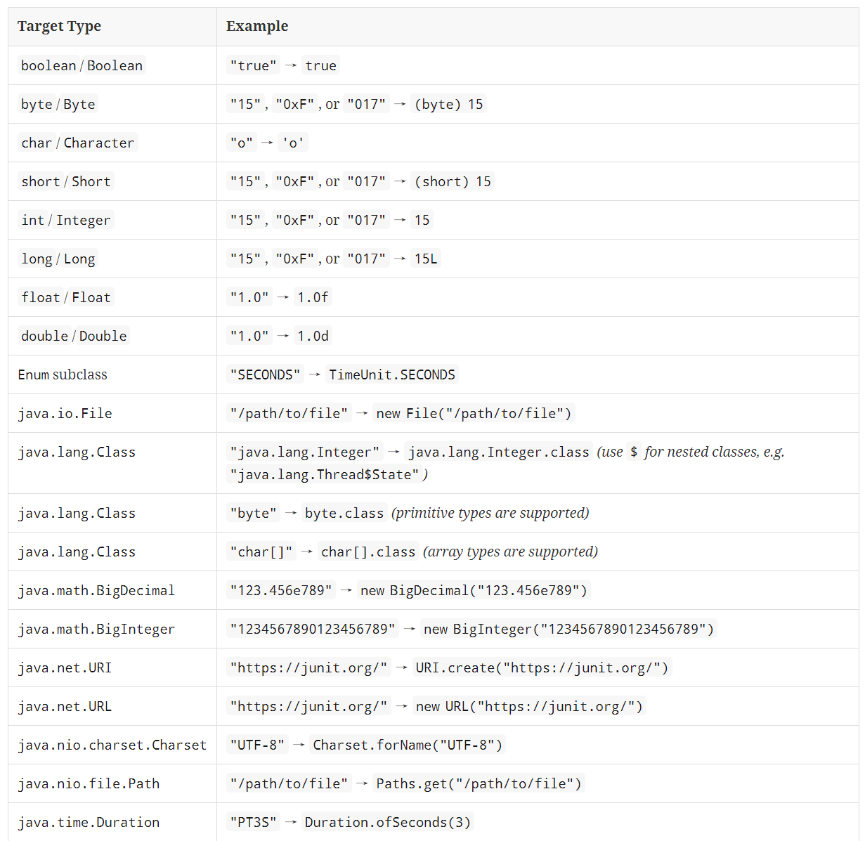 JUnit Jupiter会对String类型进行隐式转换。比如: