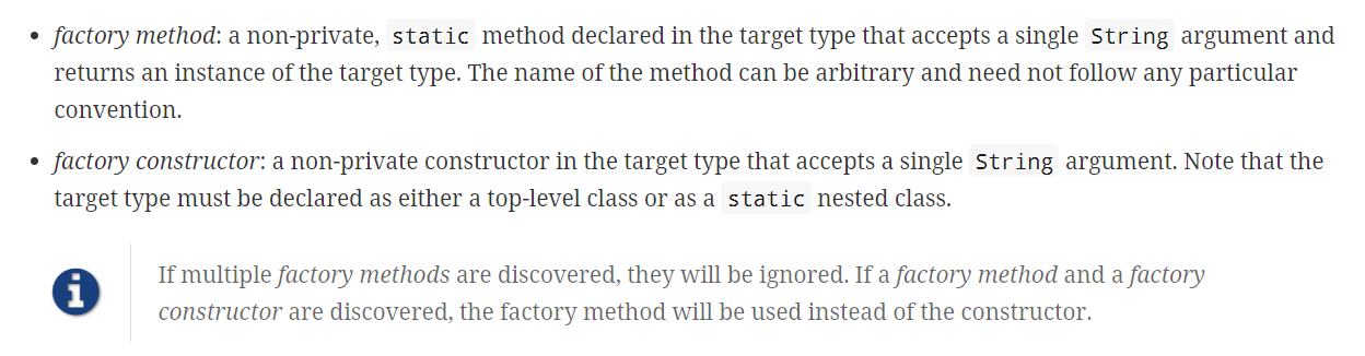 JUnit Jupiter会找到Book.fromTitle(String)方法,然后把@ValueSource的值传入进去,进而把String类型转换为Book类型。转换的factory方法既可以是接受单个String参数的构造方法,也可以是接受单个String参数并返回目标类型的普通方法。详细规则如下(官方原文):