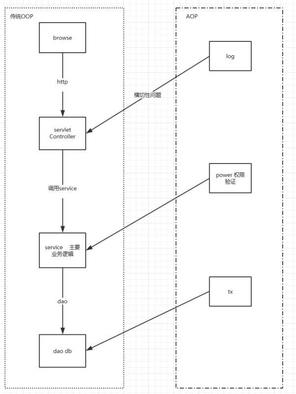 与OOP对比,AOP是处理一些横切行问题。这些横切性问题不会影响到主逻辑的实现,但是会散落到代码的各个部分,难以维护。AOP就是把这些问题和主业务逻辑分开,达到与主业务逻辑解耦的目的。