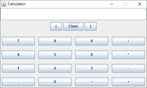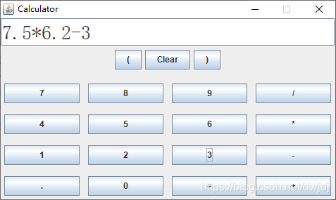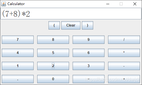 首先先设计一个GUI界面,先设置一个JFrame容器,容器中创建两个面板和若干按钮,先把按钮要显示的文字存入字符串数组,然后依次创建几个按钮。在设置一个文本框,用来接收用户输入的内容,centerPanel.setLayout(new GridLayout(4, 4, 12, 16));设置中间面板的布局为网格布局,并指定该容器的行数和列数以及组件之间的水平、垂直间距。centerPanel.setBorder(BorderFactory.createEmptyBorder(5, 5, 5, 5));为面板创建一个框,框的头部为5像素,左为5像素,底部为5像素,右为5像素宽。再设置单行文本域的大小,字体,风格和字号,然后为各按钮设置监听器。定义一个StringBuffer类,用于保存触发产生的内容,在用txt.setText(r.toString());方法将内容输出在文本框中,clear按钮触发后,用r.delete(0,r.length());方法清空字符串中的内容并将结果显示在文本框中,“=”按钮是把触发器触发的数字保存StringBuffer里面,然后用该类的toString()方法返回StringBuffer缓冲区中的字符对象,用String类型的变量接收,该字符串接收到的就是一个中缀表达式,创建一个类,该类用于将输入的中缀表达式进行计算,把计算的结果返回给“=”按钮触发器中的result变量,把该变量转化为字符串输出在文本框中。