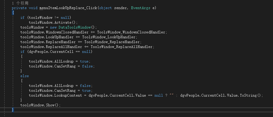 实例化一个DataToolsWindow后对事件进行注册。重点是如何查找,因为替换和查找一样,只要查找到了替换就行了。