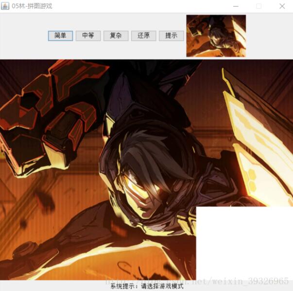 (5)添加还原图片功能。在每一次完成游戏之后,或者感觉太难想从头来过,按照人们的思维,总想点击一键还原。还原的算法有智能的搜索算法,有广度,深度,a+等,输入人工智能中的八数码问题,还有最简单的直接“重置”,我采用代码量少的重置,留下八数码当成提示功能。思想是先将按钮显示的图片重置,再还原按钮的两个属性。