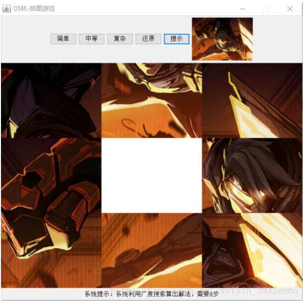 (5)在上述功能实现之后,此设计初具备一个拼图游戏的功能了。在兴趣之下想做提示功能,本意想做出根据当前局面。搜索出最佳的步骤并提示,但是对广度搜索的学习不够,只能算出最短步骤次数,还不会将最短路径回溯显示出来。所以只能做出简单的提示,搜索的过程显示在eclipse控制台。