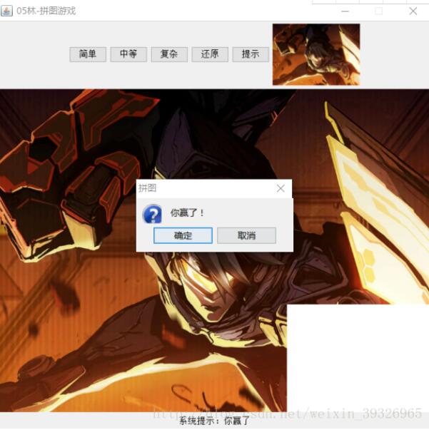 if(win()&&jishu!=0) {jishu=0;JOptionPane.showConfirmDialog(null, "你赢了! " ,"拼图",JOptionPane.CANCEL_OPTION); }