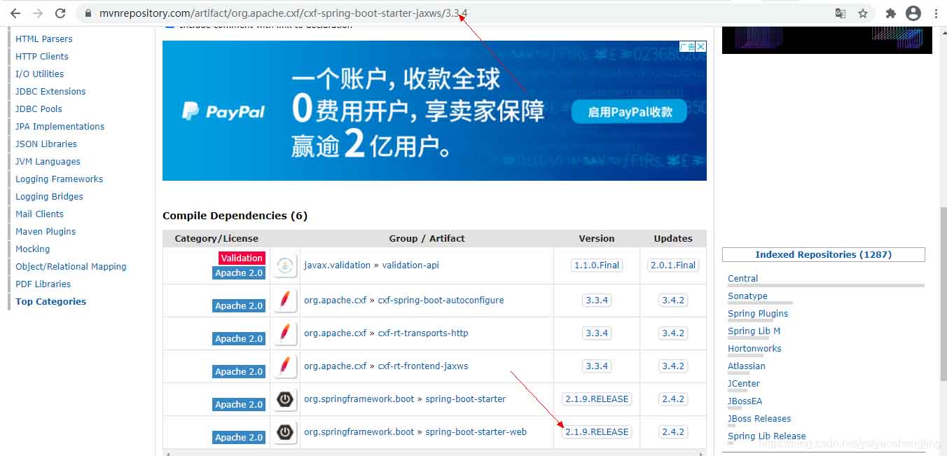在https://mvnrepository.com/artifact/org.apache.cxf/cxf-spring-boot-starter-jaxws查找到jaxws的各种版本,进入之后可以看到对应的springboot版本