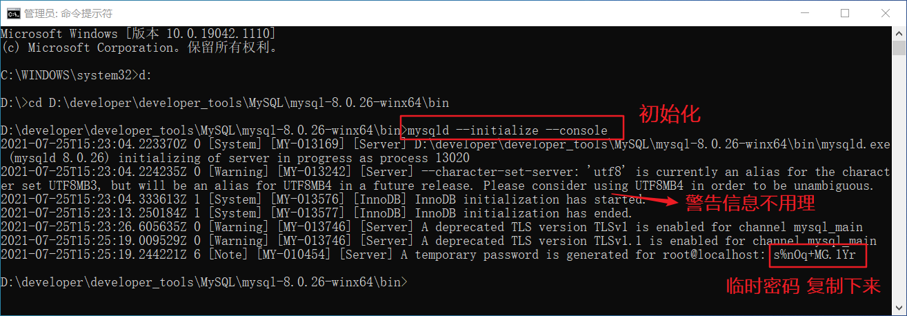 管理员CMD进入解压后的bin目录,输入mysqld --initialize --console