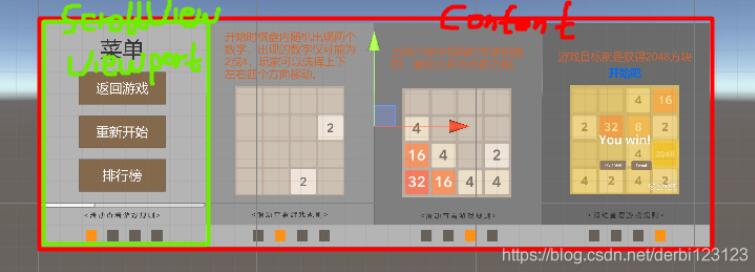 在做2048这个游戏时,因为菜单页面还能查看游戏规则,而这些规则又不在同一个页上,所以需要滑动页面实现页面切换,但是仅仅使用unity提供的组件做出的效果仅有一个切换的意思,交互感很差,所以在组件的基础上又写了一个控制页面切换的类。而界面切换就是实现一个滚动的视图。
