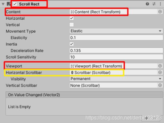 为ScrollView添加Scroll Rect组件,并把Viewport拖给Scroll Rect组件的Viewport属性,再把Content拖给Scroll Rect组件的Content属性,滚动条看需要加吧,我加了一个水平滚动条,滚动条并不用加以过多的控制,unity已经把滚动条和Scroll Rect的组合使用做的很好了。其他属性的配置在官方手册中讲的很清楚。