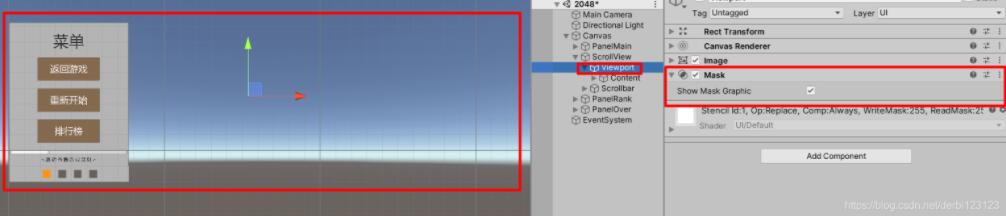 因为我们只能看到视口下的内容,由于Content可能有很多界面组成,所以我们可以采取遮罩的方式来不渲染我们看不到的东西,也就是只渲染视口,来提高效率,unity给我们提供了这样一个组件帮助我们实现这个功能: