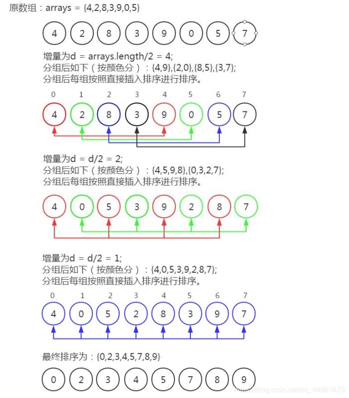 简单解释:希尔排序是插入排序的改进版,我们理解一个叫做下标差的的东西,也就是下面那个图中的增量d,初始下标差为arr.length/2,然后继续/2,对在同一下标差(相当于把这几个数单独拿出来了)的若干个数进行插入排序即可。