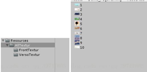 创建Resources文件夹 在内创建子文件夹FrontTextur(正面)和VersoTextur(反面)用来存放一本书的正反面图片 把自己准备的图片导入 为了方面动态加载我都用数字代替第几页