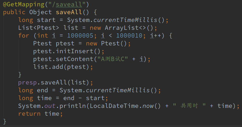 这saveAll明明就是循环调用save方法了啊,我们写个简单的测试插入数据方法试一下: