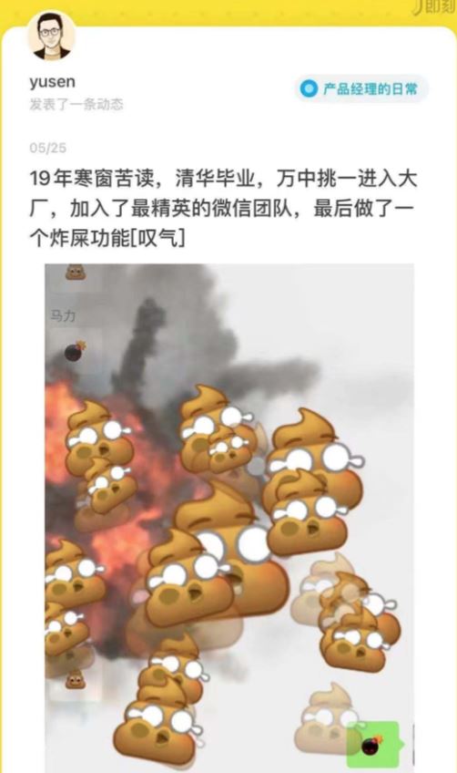 不知道大家是否经历过那样一个时候,小时候(我是说很小的时候,在我还在上小学的时候)过年也尝试过这种恶趣味,没想到微信给它做成了一个线上版本。这个功能发明,连创造产品的本人也进行了调侃。但是能做一个功能让全民玩的开心,也不枉产品的出现的意义了。