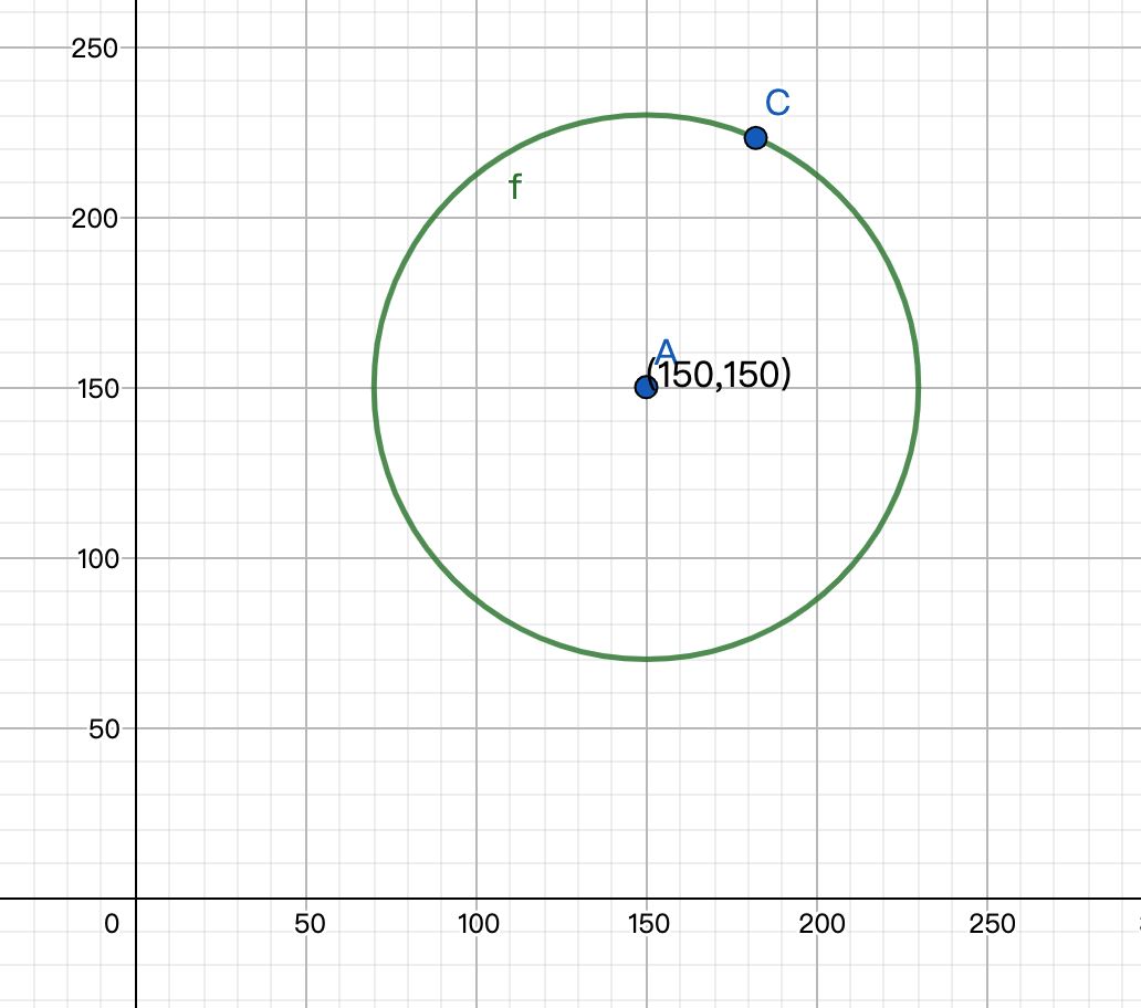 由于用中心点为 (150,150) 为圆心计算比较麻烦,因此我将中心点移到了(0, 0)进行计算,最后再将所有计算出来的点都往 x 轴,y 轴平移 150。