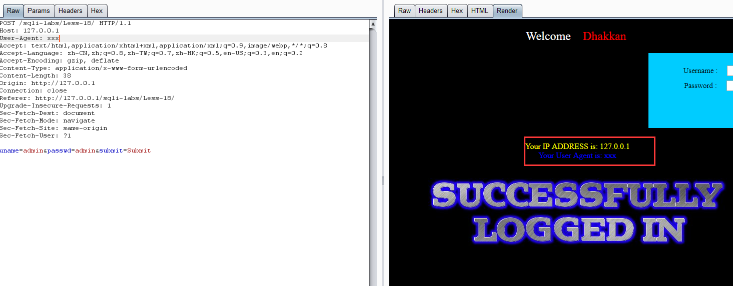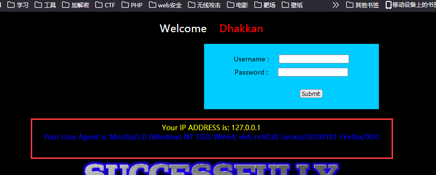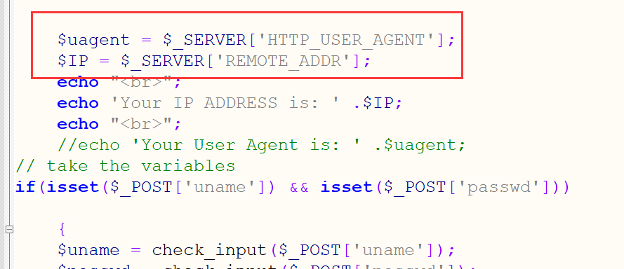 显示ip和User Agent,通过分析源码,这里对uname和passwd参数进行了处理,但是还有两个新的全局变量可控,ip和user-agent: