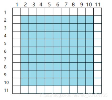 在这里我们需要用二维数组来创建两个棋盘,一个用于展示给玩家,并储存排雷信息;一个用于在后台随机生成雷并储存。假如我们要打印9X9的棋盘,那我们的二维数组大小也是9X9的吗?,不能,因为我们在设计算法时需要统计该坐标周围8个方位雷的个数,假如要统计边界坐标周围雷的个数,那么就会有数组越界的问题,那我们就要在9X9的边界多上一圈元素,也就要定义11X11的数组元素,这些多出来的一圈元素我们在打印棋盘的时候进行限制不要打印出来就行,如下图: