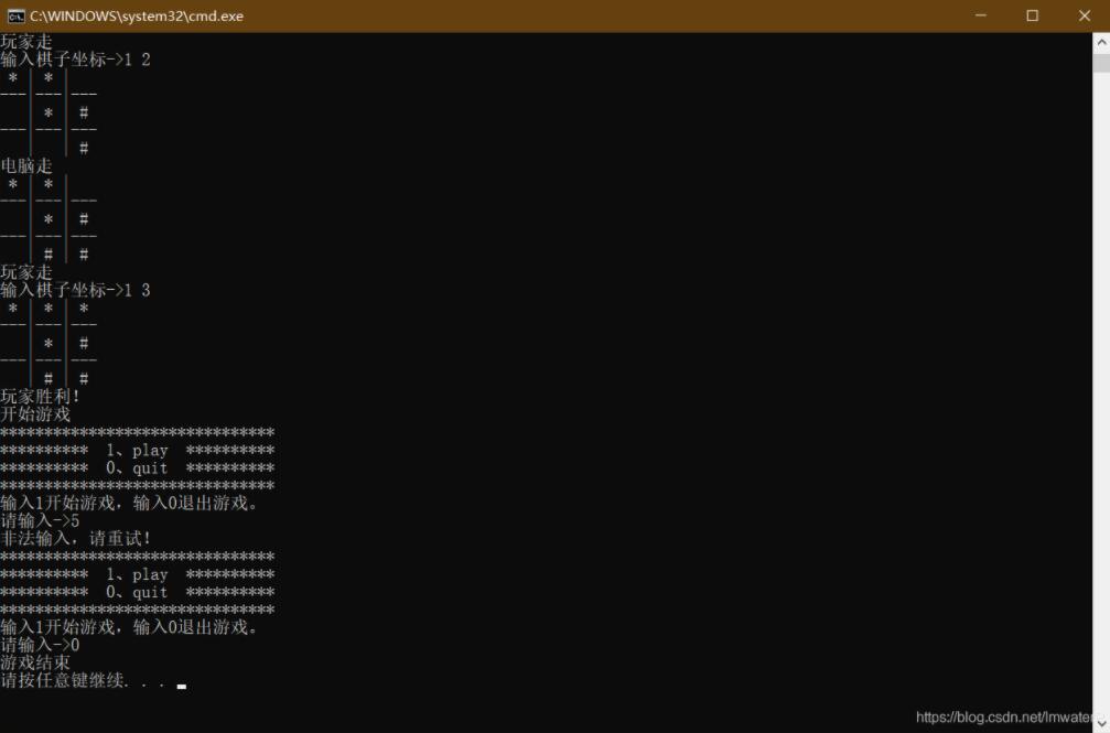 井字棋是一个很常见的小游戏。要求对战双方在一个“井”形的棋盘里分别下“*”棋子或者“#”棋子,谁先连成3个,谁就赢。