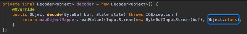 redisson结合Spring使用时,会有RedissonSpringCacheManager,将redissonClient自动注入,另外还有codec的概念,即序列化和反序列化,可以查看实现类,就几种实现,假设我们使用org.redisson.codec.JsonJacksonCodec,可以看到,decode中,仅一个Object.class,即范型信息并未带入,故出现了问题