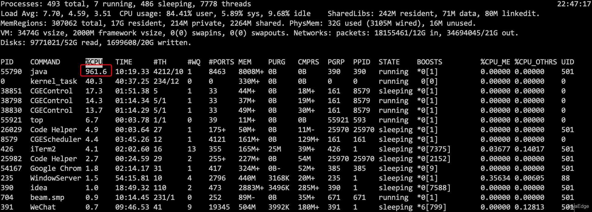 使用top命令,我们看到Java进程的CPU使用率达到了961.6%,注意到进程ID是55790。