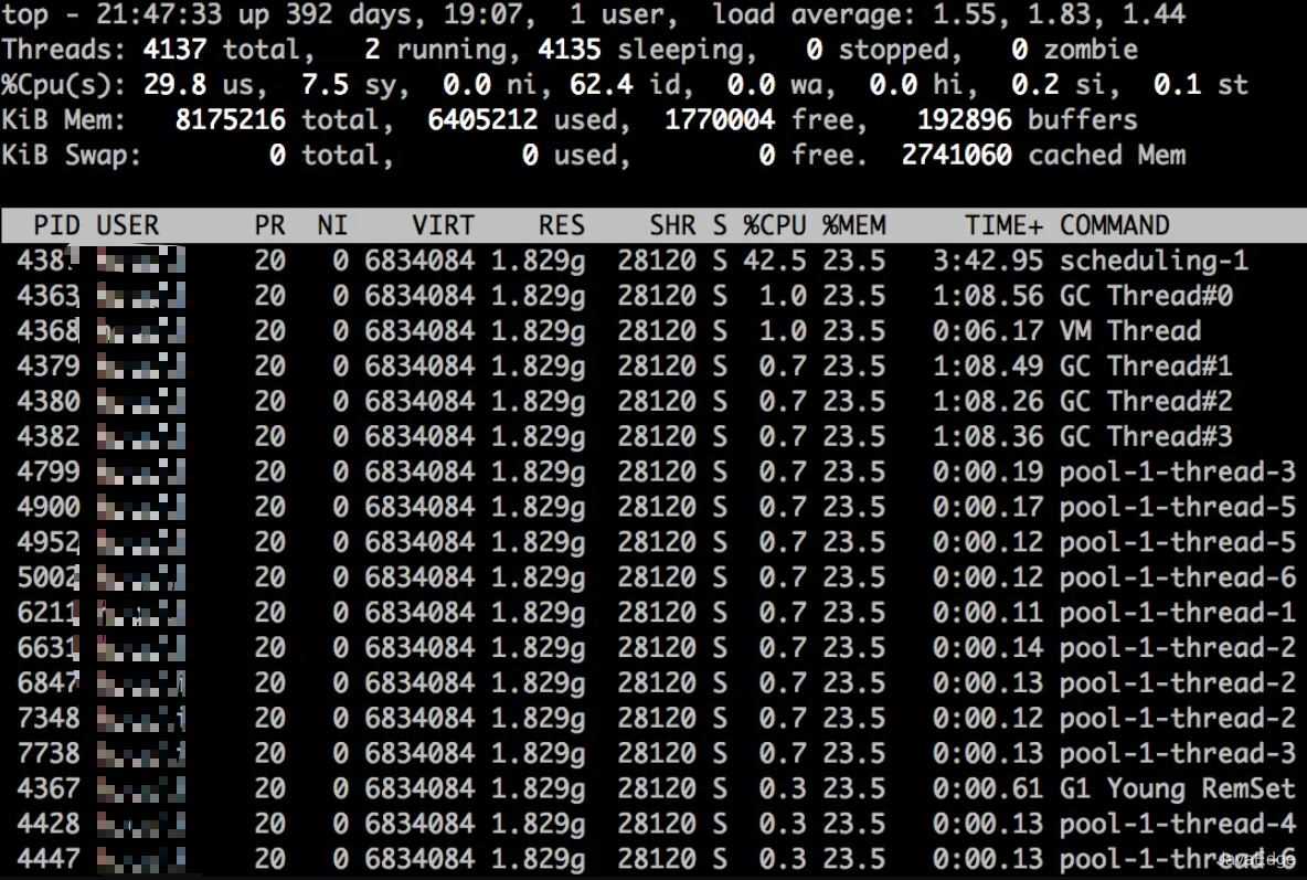 经历上述过程,往往已经可以定位到大量消耗CPU的线程及bug代码,比如死循环。但对于该案例:Java进程占用的CPU是961.6%, 而“scheduling-1”线程只占用了42.5%的CPU,那其它CPU被谁占用了?