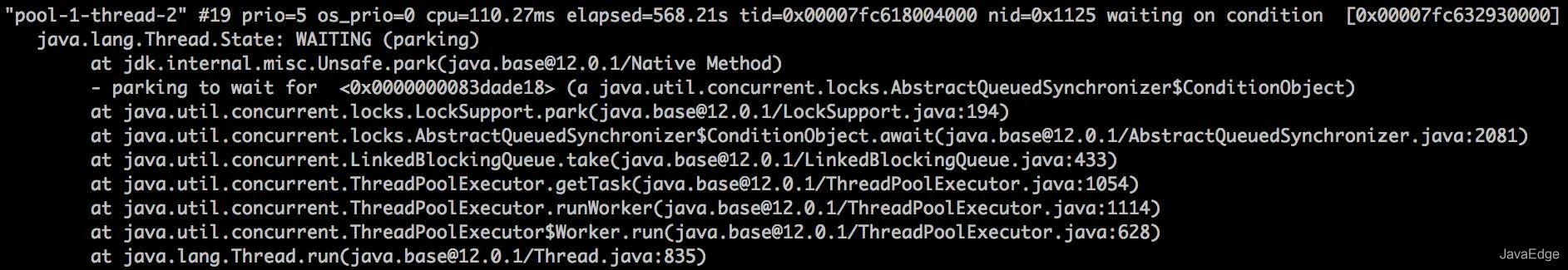 回到我们的“pool-1-thread-x”线程,这些线程都处在“Waiting”状态,从线程栈我们看到,这些线程“等待”在getTask方法调用上,线程尝试从线程池的队列中取任务,但是队列为空,所以通过LockSupport.park调用进到了“Waiting”状态。那“pool-1-thread-x”线程有多少个呢?通过下面这个命令来统计一下,结果是4096,正好跟线程池中的线程数相等。