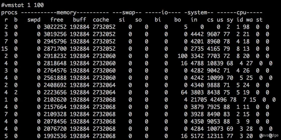 下面通过vmstat命令来查看一下操作系统层面的线程上下文切换活动: