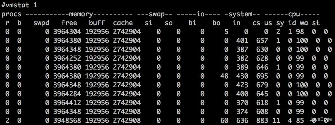 停止Spring Boot程序,再次运行vmstat命令,会看到in和cs都大幅下降,这就证实引起线程上下文切换开销的Java进程正是55790。