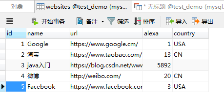 INSERT INTO `test_demo`.`websites` (`id`, `name`, `url`, `alexa`, `country`) VALUES ('2', '淘宝', 'https://www.taobao.com/', '13', 'CN');