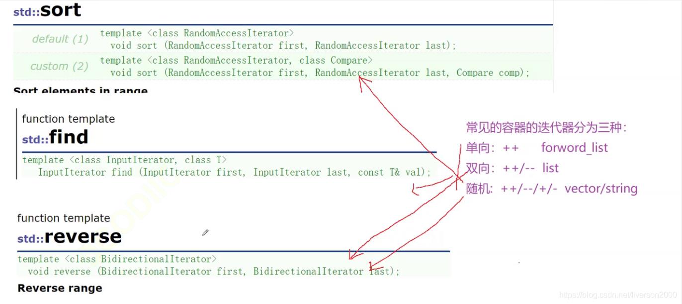 我们可以看到这三个函数的迭代器是不同的,它们是继承关系,随机的支持双向,双向支持单向,反过来就不行。