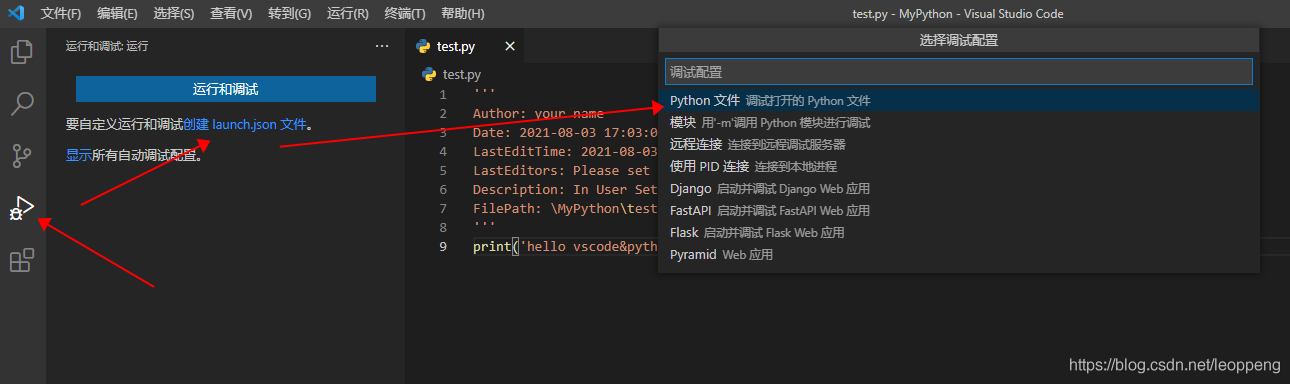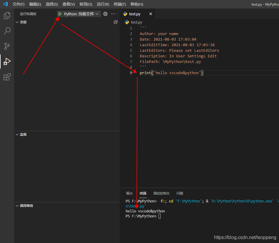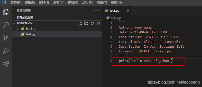 新建一个文件夹,用vscode打开。新建文件test.py,里面写:print('hello vscode&python')