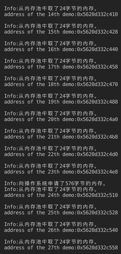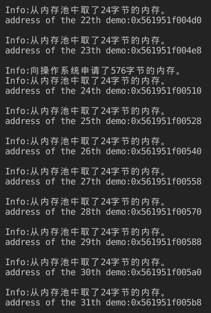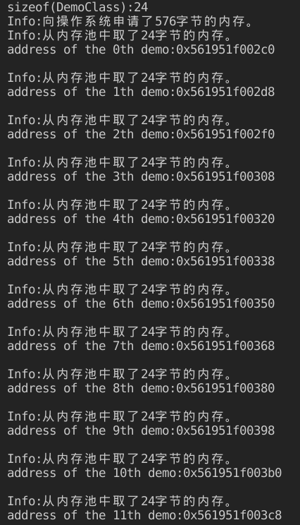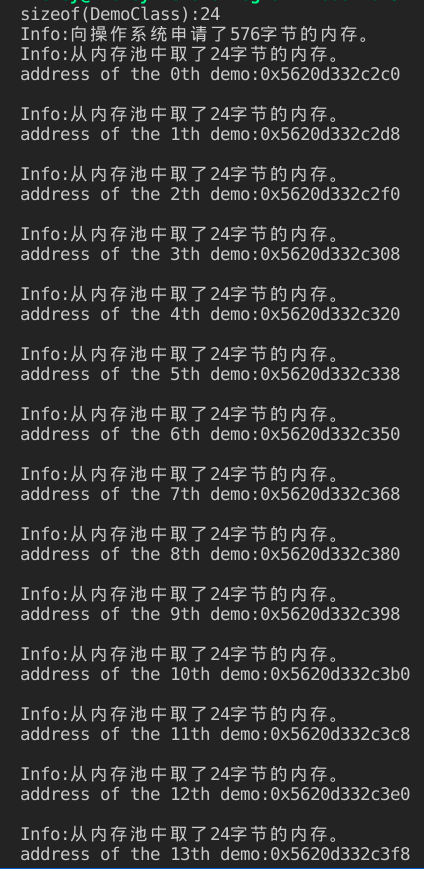 可以看到每个DemoClass的实例大小为24字节,内存池一次从操作系统中申请了576个字节的内存,这些内存可以容纳24个实例。上面显示出了每个实例的内存地址,内存池中相邻实例的内存首地址之差为24,即实例的大小,证明了一个内存池的实例之间确实没有cookie。