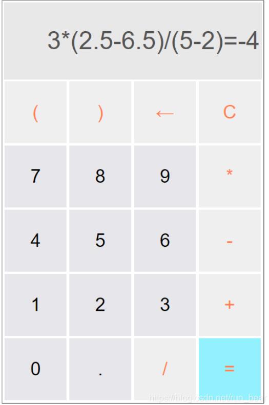 最终展现的页面如下图,当鼠标点击按键时,按键会变色,可以进行四则混合运算