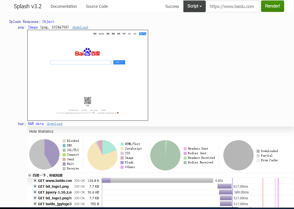 上面有个输入框,默认是http://google.com,我们可以换成想要渲染的网页如:https://www.baidu.com然后点击Render me按钮开始渲染,页面返回结果包括渲染截图、HAR加载统计数据、网页源代码: